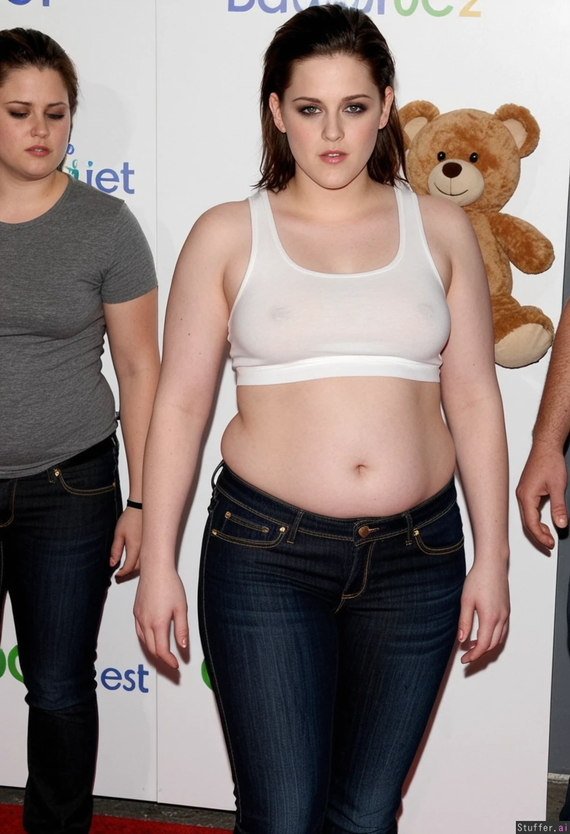 Kristen Stewart with a stuffed, bloated belly, wearing tight jeans and crop top. (Kristen_Stewart)(slightly_chubby)