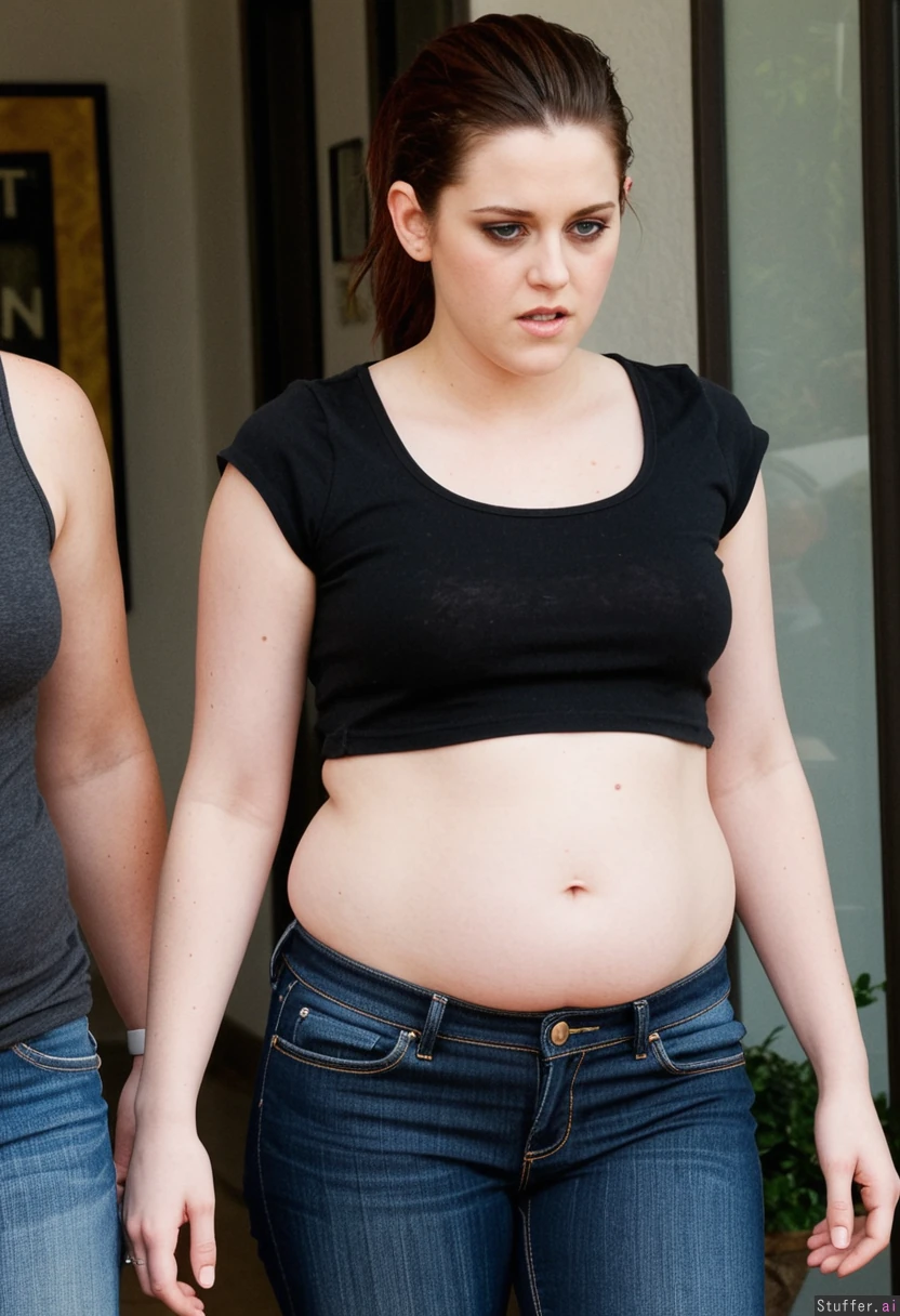 Kristen Stewart with a stuffed, bloated belly, wearing tight jeans and crop top. (Kristen_Stewart)(1girl)(slightly_chubby_belly)