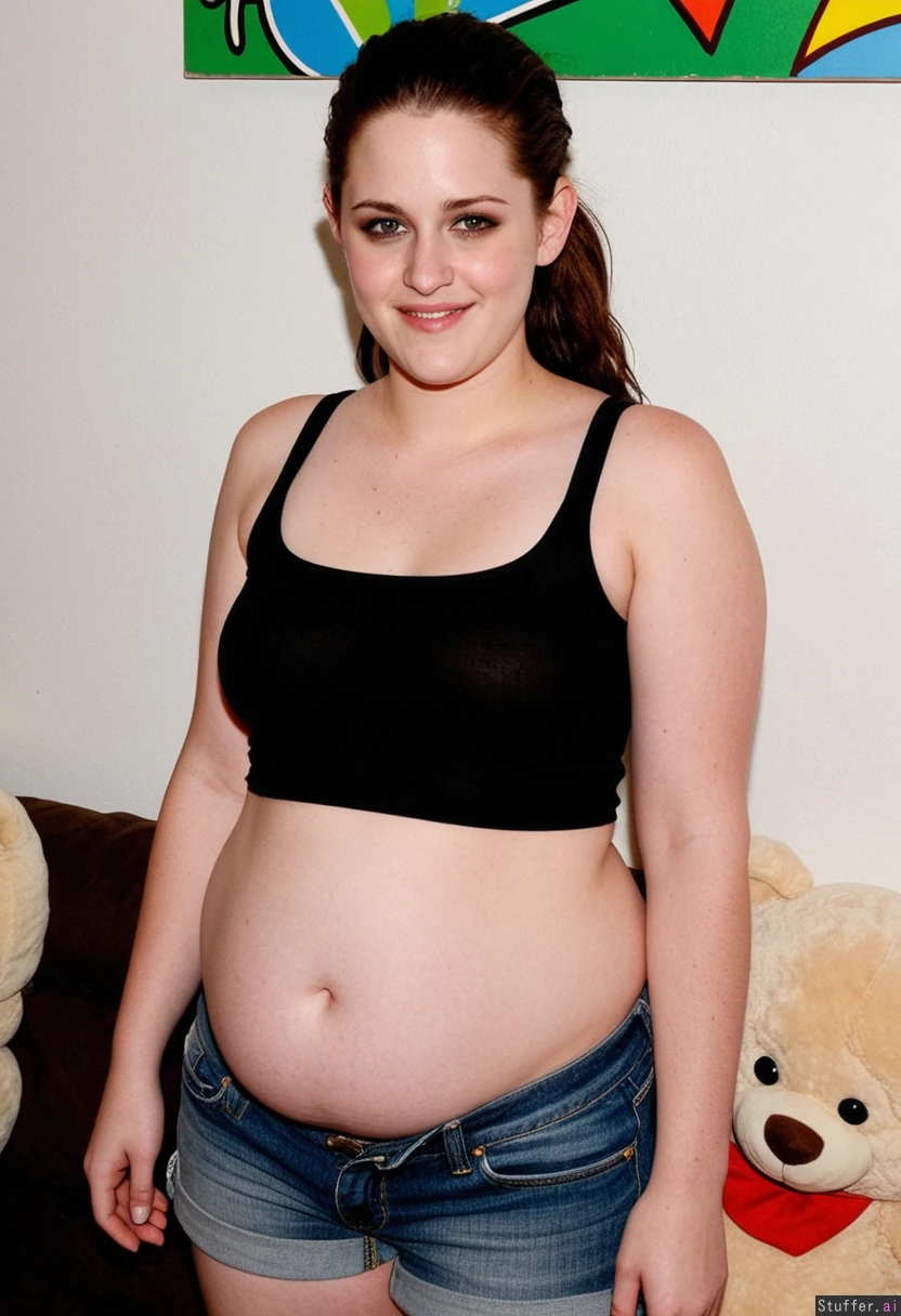 Kristen Stewart with a stuffed, bloated belly, wearing tight jean shorts and a crop top.
