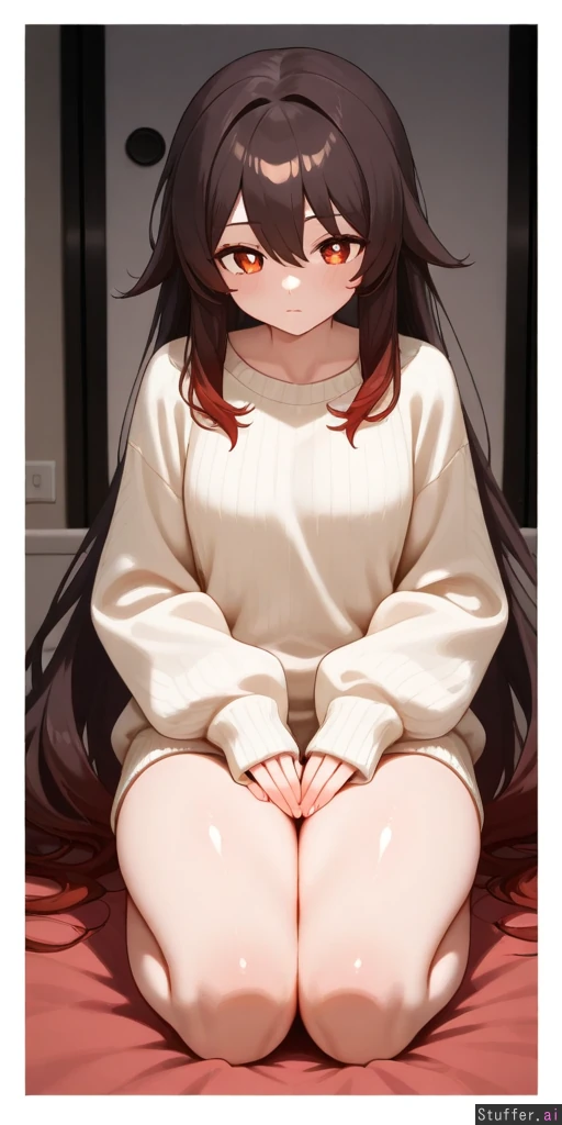 1 girl, ((hu tao)) tight clothes, oversized sweater, no shorts, no skirt evening, bedroom, ((casual)), unkempt hair, long_legs, (thighs touching:1.2), thighs, sitting on knees, kneeling