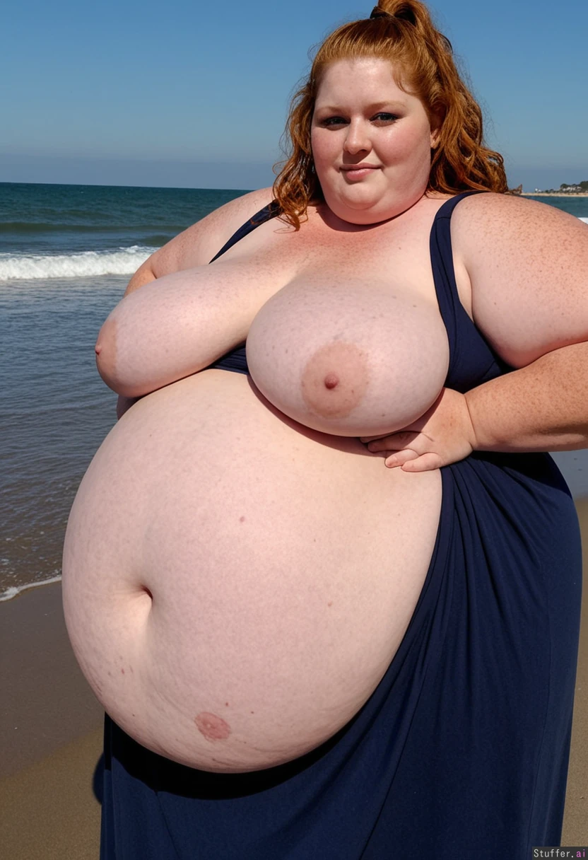 (((Huge ssbbw))) in her forties. Ginger wavy hair in a ponytail and blue eyes. (((Wearing a long dark dress))). (((Massive morbidly obese))). Waddling along a beach. (((Big round belly))). (((Fat arms))).