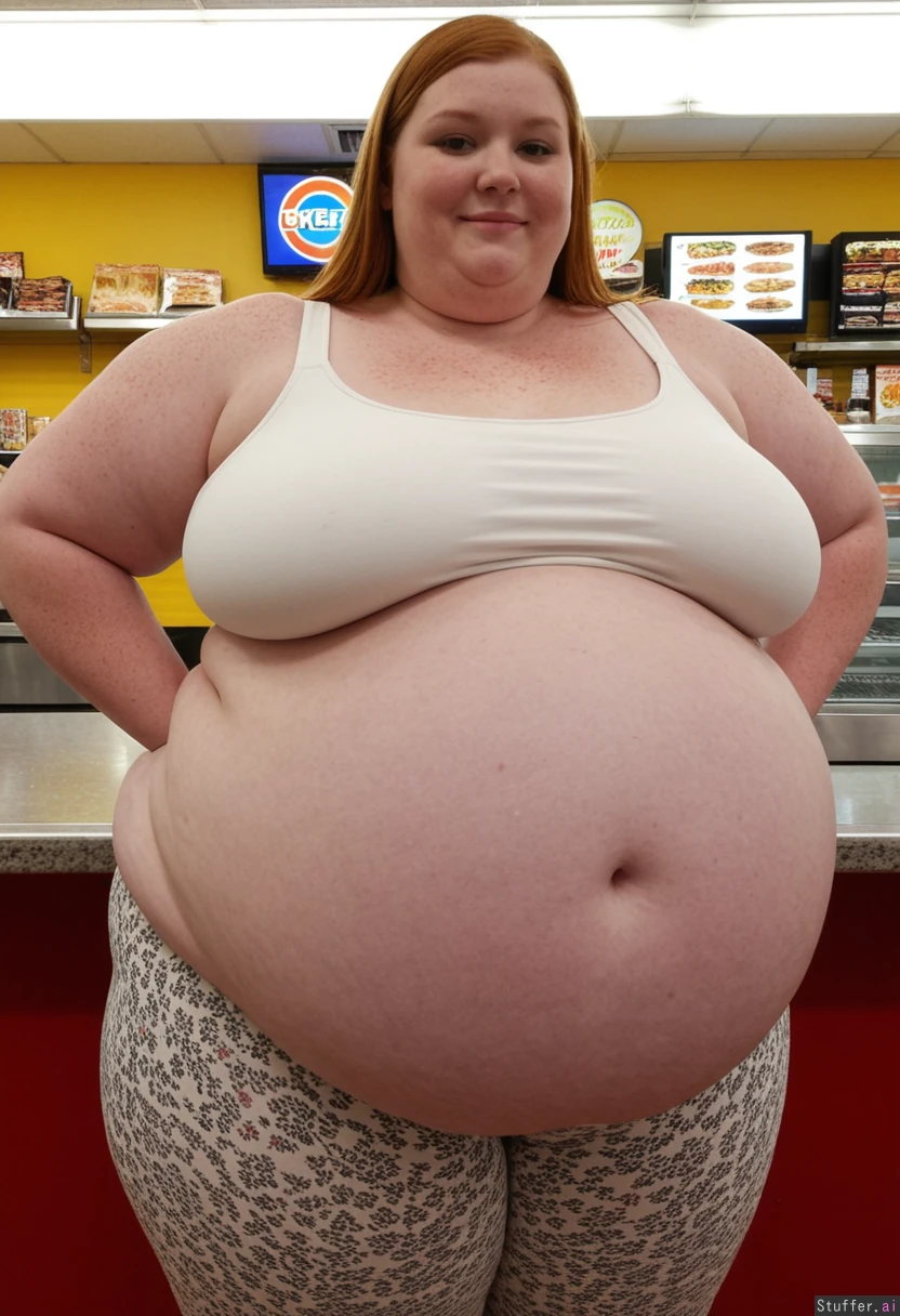 ((38 year old beautiful ginger MILF pale skin woman wearing white sports bra and floral leggings standing in a fastfood restaurant, candid pose, full body side view)), (fat face), ((((short heavy build, fat arms, fat neck, broad shoulders)))), (freckles, skin pores), pale skin, very long straight ginger hair, big doe eyes, (((((huge round bloated belly, big belly, heavy potbelly))))), (((wide hips), voluptuous)), deep navel, hourglass figure, pure milky white skin, big happy smile, grinning, dimples, (wet dripping glistening skin) enormous bloated shiny overdue soft belly very large big sagging tits deep cleavage shiny inflated lower belly deep bellybutton