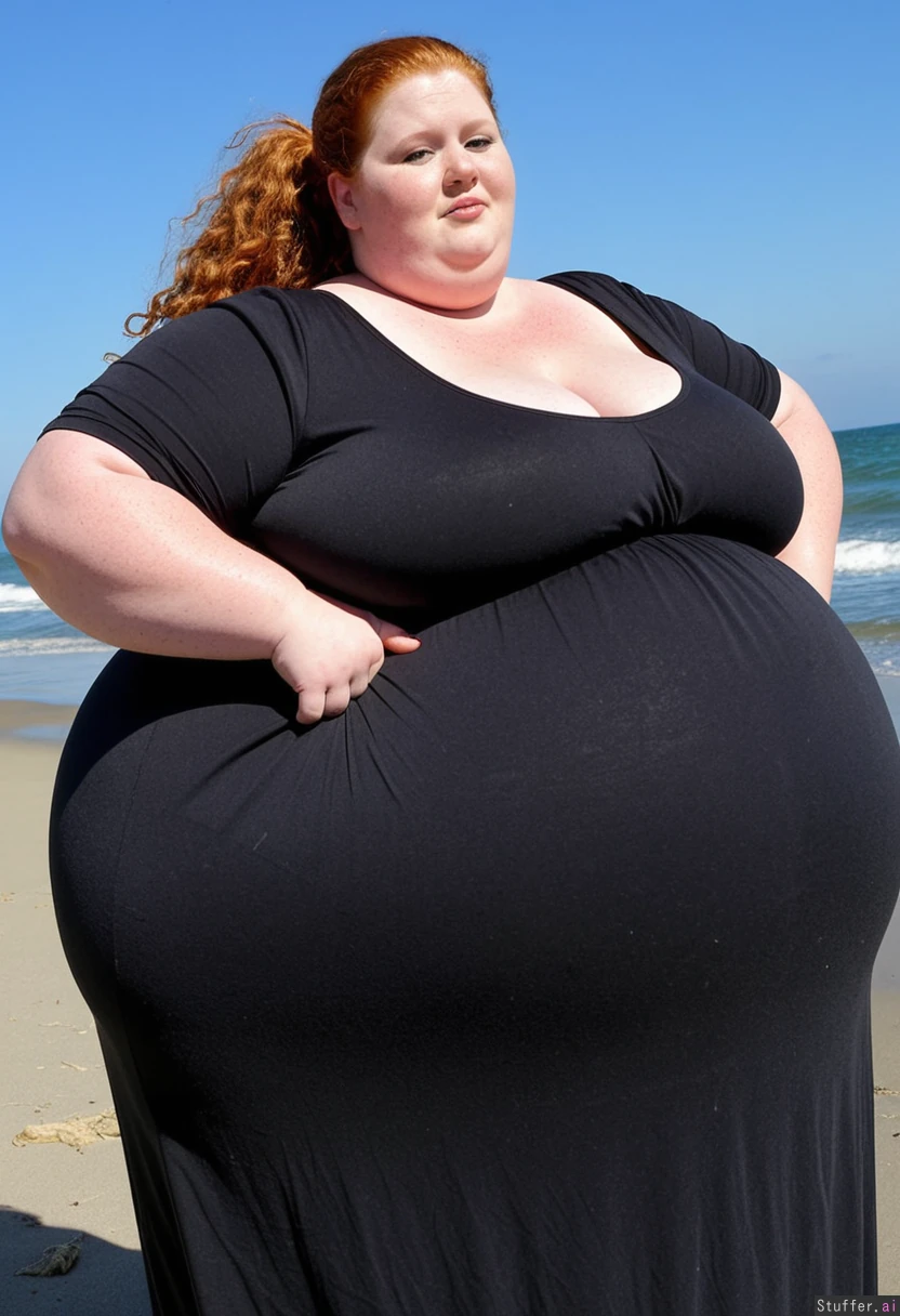 (((Huge ssbbw))) in her forties. Ginger wavy hair in a ponytail and blue eyes. (((Wearing a long dark dress))). (((Massive morbidly obese))). Waddling along a beach. (((Big round belly))). (((Fat arms))).