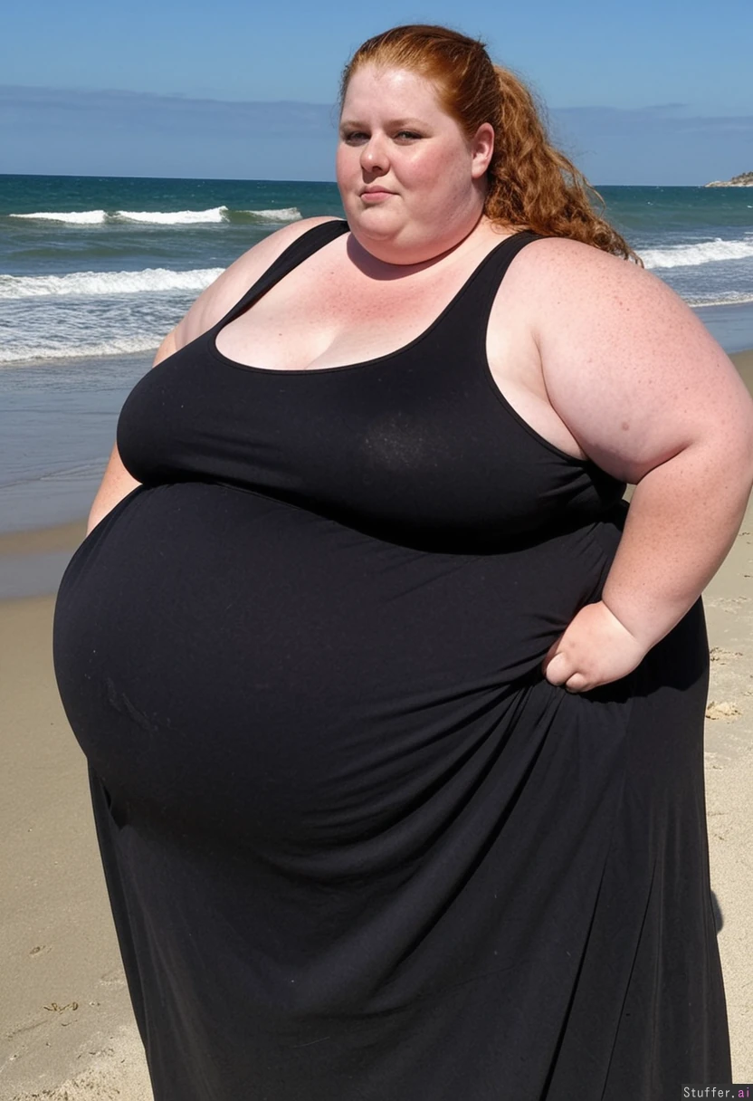 (((Huge ssbbw))) in her forties. Ginger wavy hair in a ponytail and blue eyes. (((Wearing a long dark dress))). (((Massive morbidly obese))). Waddling along a beach. (((Big round belly))). (((Fat arms))).