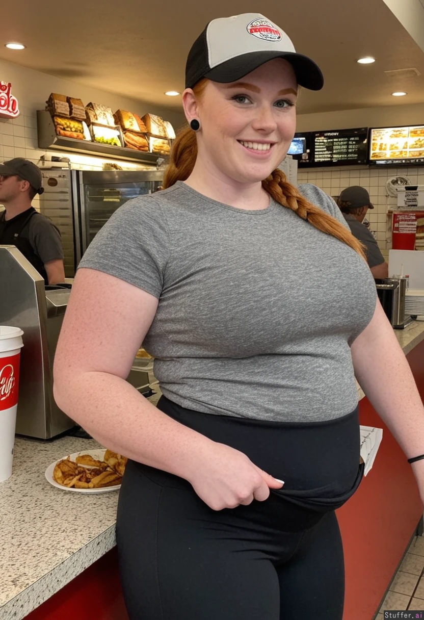 Noticeably fat ginger woman working in a fast food restaurant, tight black pants, grey t-shirt, cap on head, large ear rings, smiling