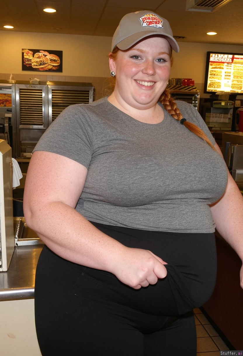 Morbidly Obese ginger woman working in a fast food restaurant, tight black pants, grey t-shirt, cap on head, large ear rings, smiling