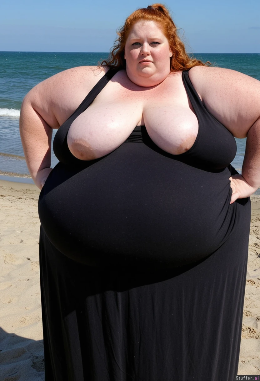 (((Huge ssbbw))) in her forties. Ginger wavy hair in a ponytail and blue eyes. (((Wearing a long dark dress))). (((Massive morbidly obese))). Waddling along a beach. (((Big round belly))). (((Fat arms))).