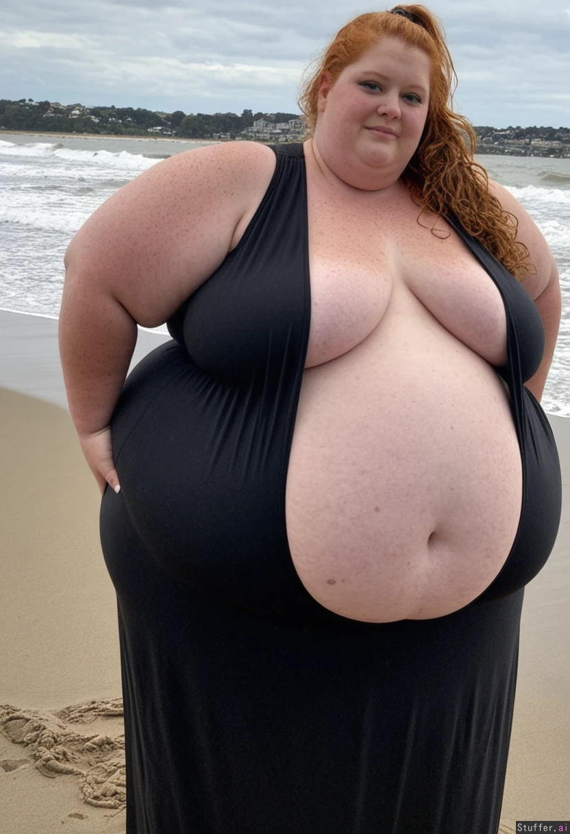(((Huge ssbbw))) in her forties. Ginger wavy hair in a ponytail and blue eyes. (((Wearing a long dark dress))). (((Massive morbidly obese))). Waddling along a beach. (((Big round belly))). (((Fat arms))).