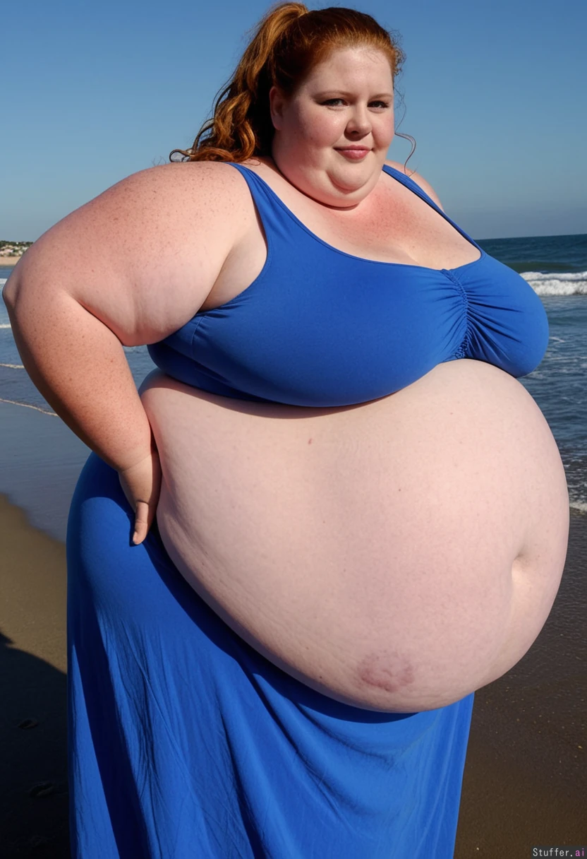 (((Huge ssbbw))) in her forties. Ginger wavy hair in a ponytail and blue eyes. (((Wearing a long dress))). (((Massive morbidly obese))). Waddling along a beach. (((Big round belly))). (((Fat arms))).