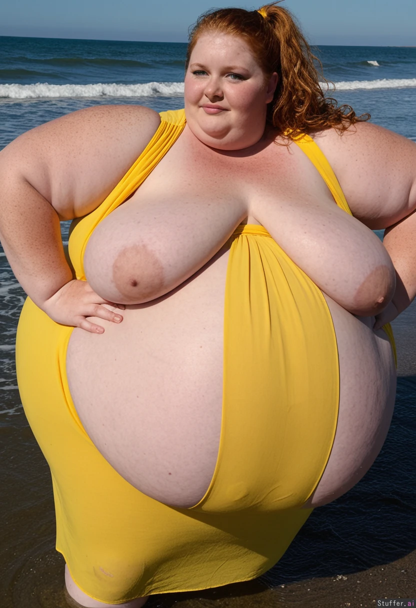 (((Huge ssbbw))) in her forties. Ginger wavy hair in a ponytail and blue eyes. (((Wearing a long yellow dress))). (((Massive morbidly obese))). Waddling along a beach. (((Big round belly))). (((Fat arms))).