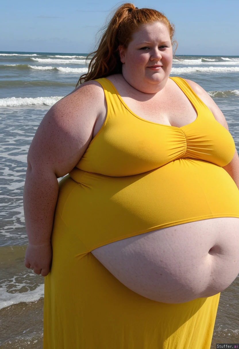 (((Huge ssbbw))) in her forties. Ginger wavy hair in a ponytail and blue eyes. (((Wearing a long yellow dress))). (((Massive morbidly obese))). Waddling along a beach. (((Big round belly))). (((Fat arms))).