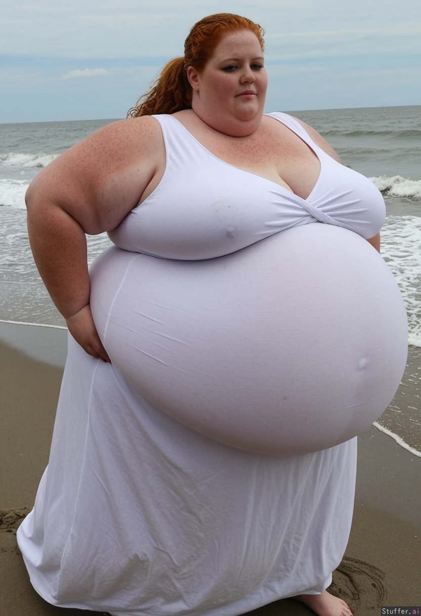 (((Huge ssbbw))) in her forties. Ginger wavy hair in a ponytail and blue eyes. (((Wearing a long white dress))). (((Massive morbidly obese))). Waddling along a beach. (((Big round belly))). (((Fat arms))).