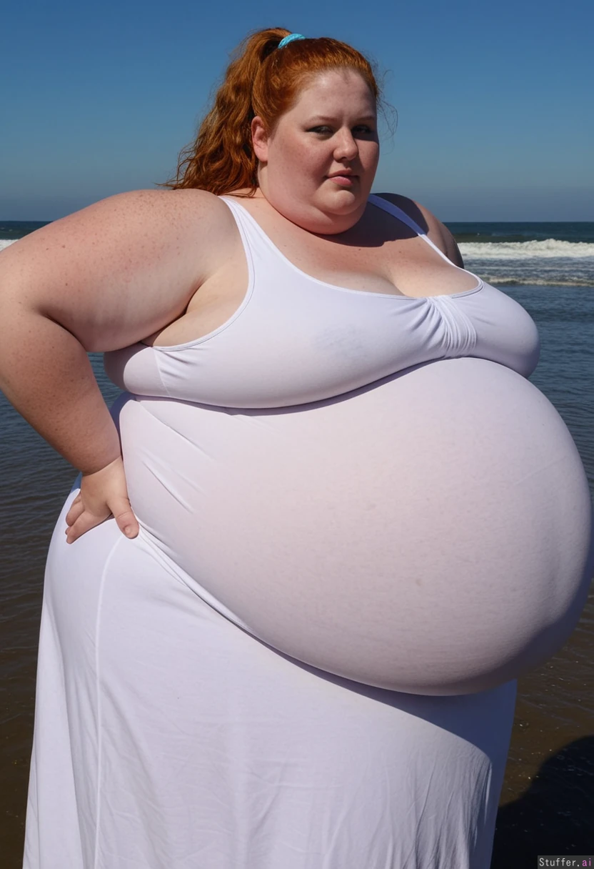 (((Huge ssbbw))) in her forties. Ginger wavy hair in a ponytail and blue eyes. (((Wearing a long white dress))). (((Massive morbidly obese))). Waddling along a beach. (((Big round belly))). (((Fat arms))).
