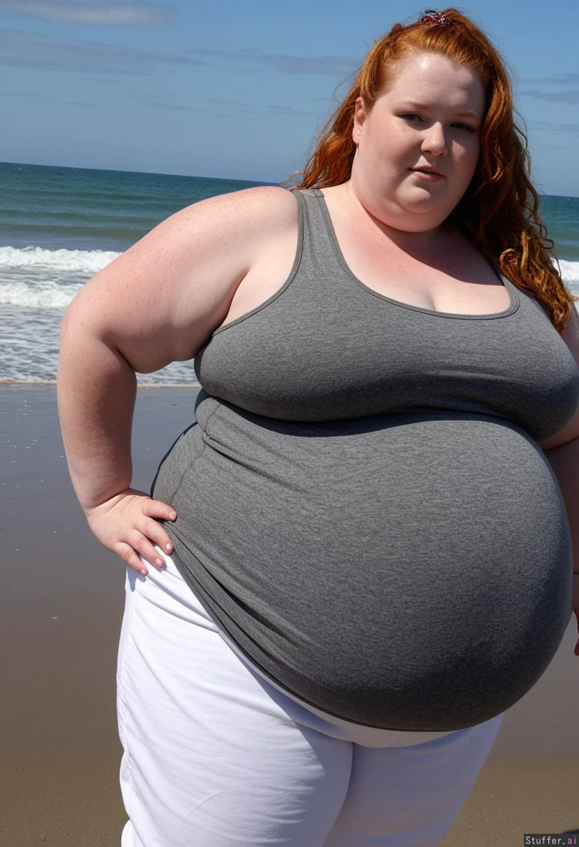 (((Huge ssbbw))) in her forties. Ginger wavy hair in a ponytail and blue eyes. (((Wearing a long grey tank top and white Capri pants))). (((Massive morbidly obese))). Waddling along a beach. (((Big round belly))). (((Fat arms))).