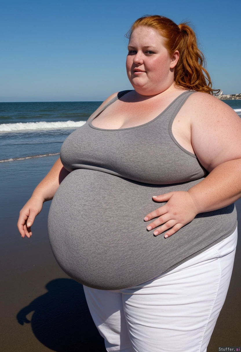 (((Huge ssbbw))) in her forties. Ginger wavy hair in a ponytail and blue eyes. (((Wearing a long grey tank top and white Capri pants))). (((Massive morbidly obese))). Waddling along a beach. (((Big round belly))). (((Fat arms))).