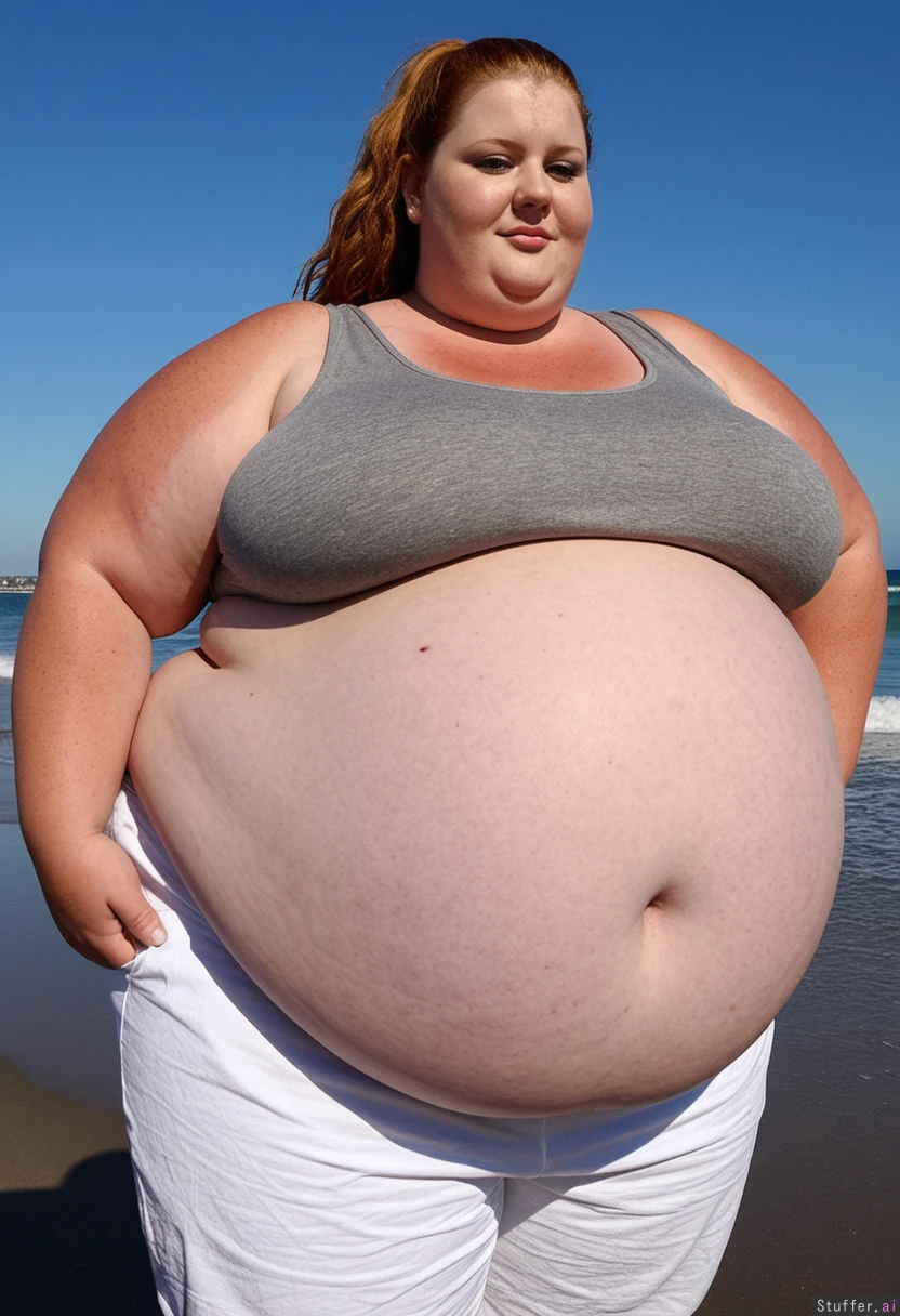 (((Huge ssbbw))) in her forties. Ginger wavy hair in a ponytail and blue eyes. (((Wearing a long grey tank top and white Capri pants))). (((Massive morbidly obese))). Waddling along a beach. (((Big round belly))). (((Fat arms))). Ssbbw blob fattened into a giant hyper obese blob, too fat to move, legs apart, oiled up, giant_round_inflated_belly, side_view, 1000kgs:1.9, arms_resting_on_belly, hyper_inflation, giant_hyper_belly, belly_bigger_than_body