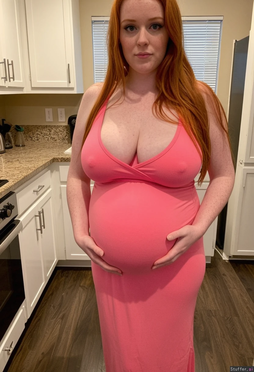 Pregnant, wearing a cute maternity dress, cleavage, weight gain, gorgeous face, fattened, belly fat, pregnant belly, breast fat, 1girl, solo, standing, big beautiful blue eyes, gorgeous long ginger hair, looking at viewer, female focus, floor, letting her belly out, kitchen, braless, covered nipples, ready to pop,