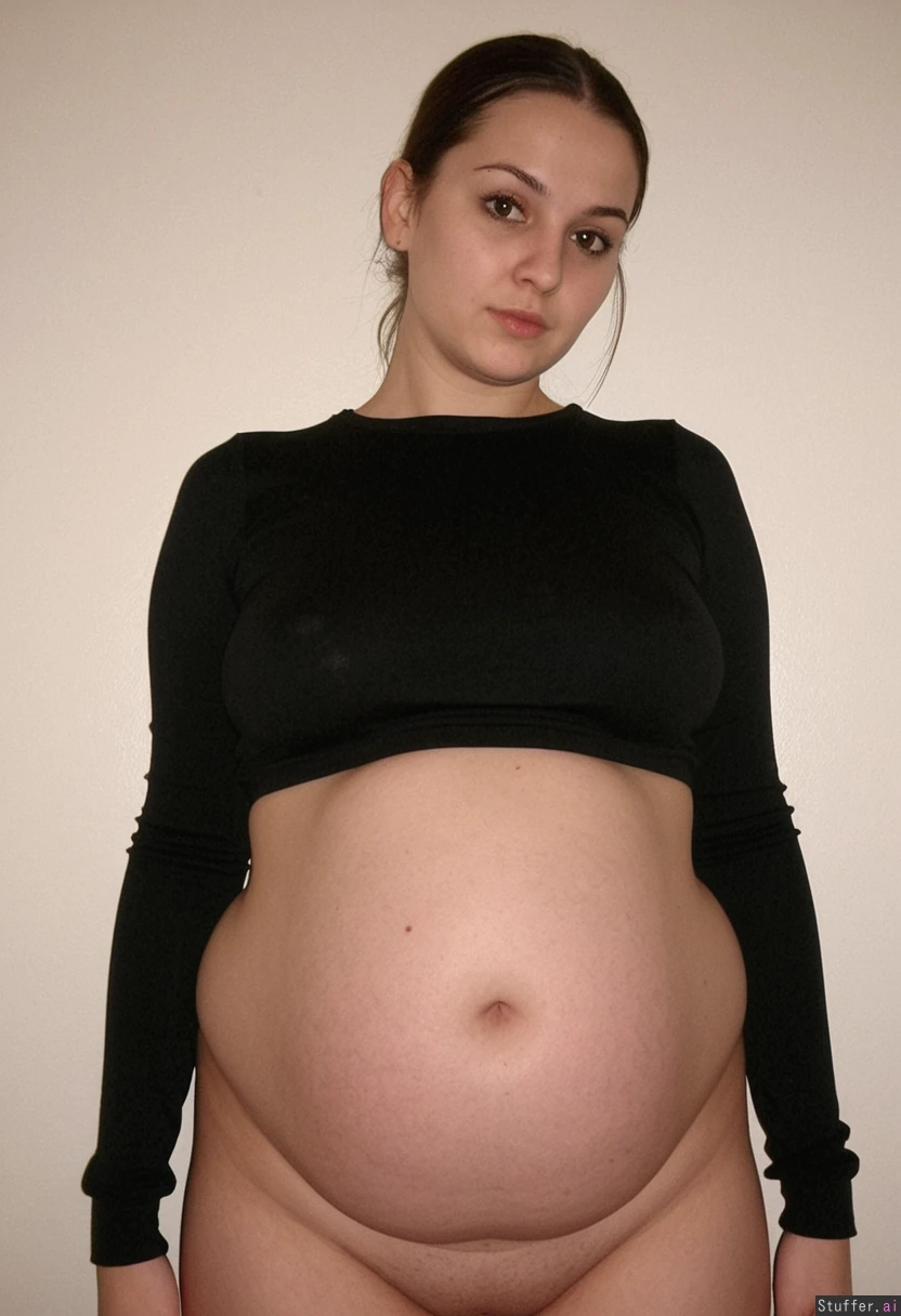 round belly on thin woman, round bloated belly, broad hips, thin shoulders, tight long sleeved shirt, long neck, intense black eyes,