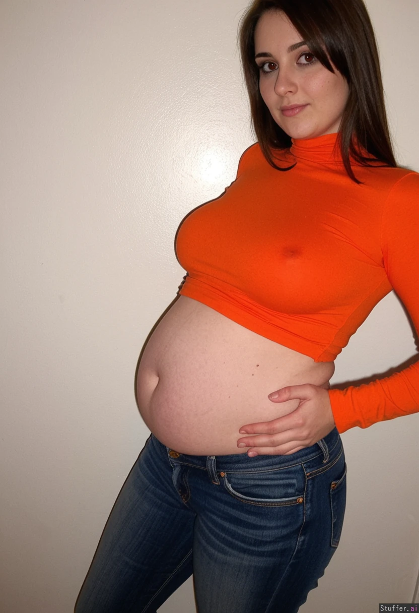 round belly on thin woman, tall, round bloated belly, broad hips, thin shoulders, tight long sleeved orange-red shirt, long neck, intense black eyes, straight brown hair, love handles, wide hips, light wash jeans,