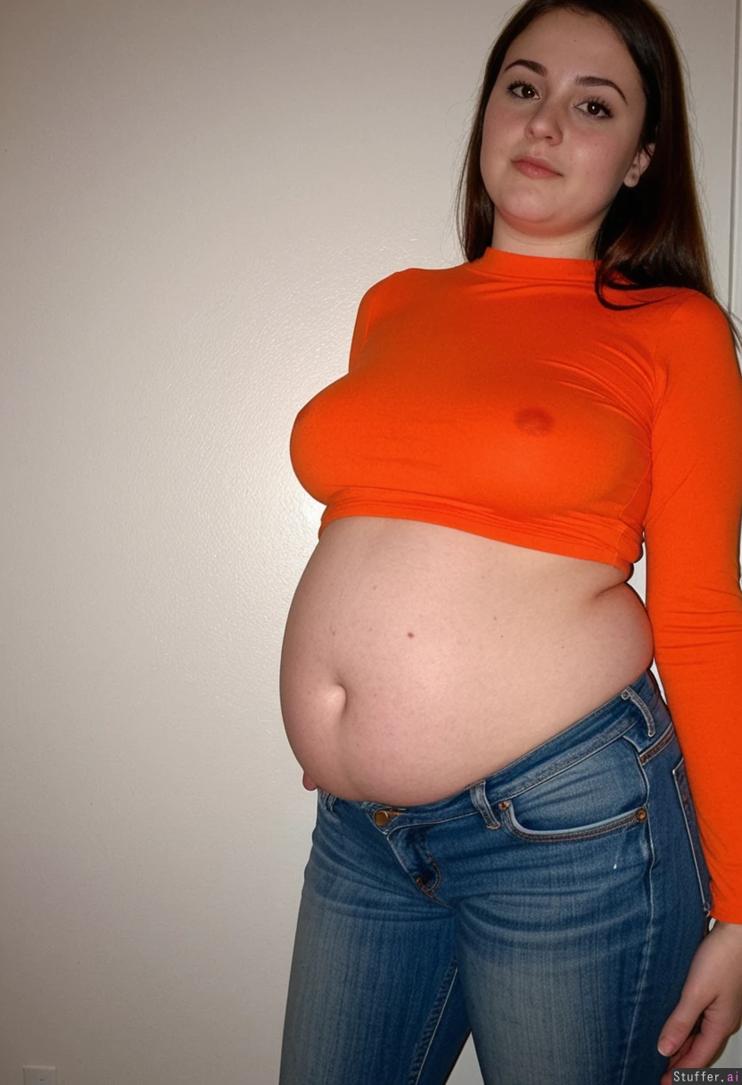 round belly on thin woman, tall, round bloated belly, broad hips, thin shoulders, tight long sleeved orange-red shirt, long neck, intense black eyes, straight brown hair, love handles, wide hips, light blue jeans,