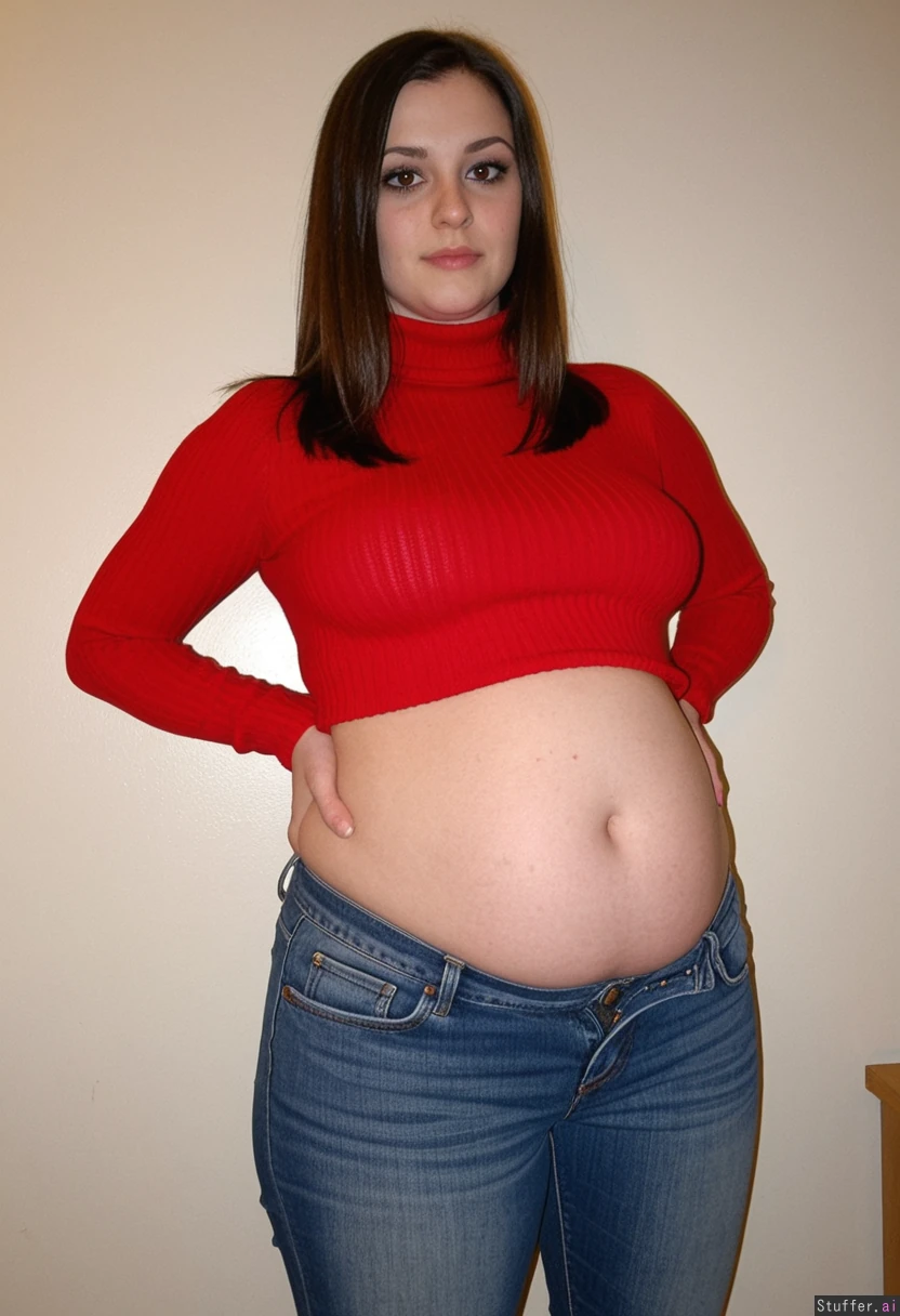 round belly on thin woman, tall, round bloated belly, broad hips, thin shoulders, tight long sleeved red sweater, long neck, ((intense black eyes)), straight brown hair, love handles, wide hips, light blue jeans,
