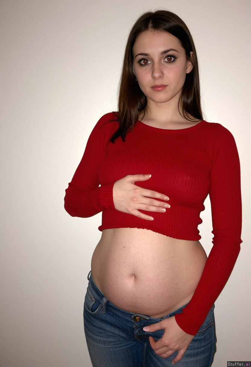 round belly on thin woman, tall, round bloated belly, broad hips, thin shoulders, tight long sleeved red sweater, long neck, ((intense black eyes)), straight brown hair, love handles, wide hips, light blue jeans, hand on belly, submissive_female