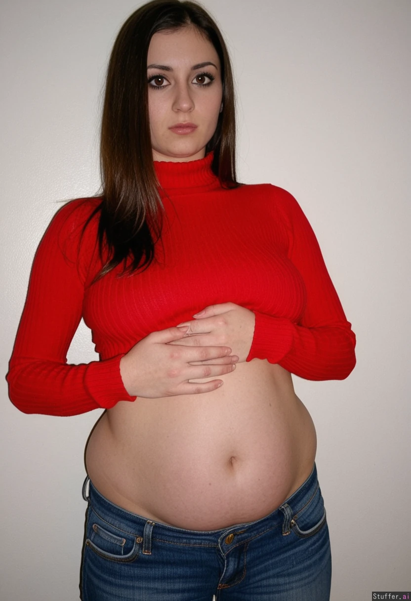 round belly on thin woman, tall, round bloated belly, broad hips, thin shoulders, tight long sleeved red sweater, long neck, ((intense black eyes)), straight brown hair, love handles, wide hips, light blue jeans, hand on belly, submissive_female , intense lighting,