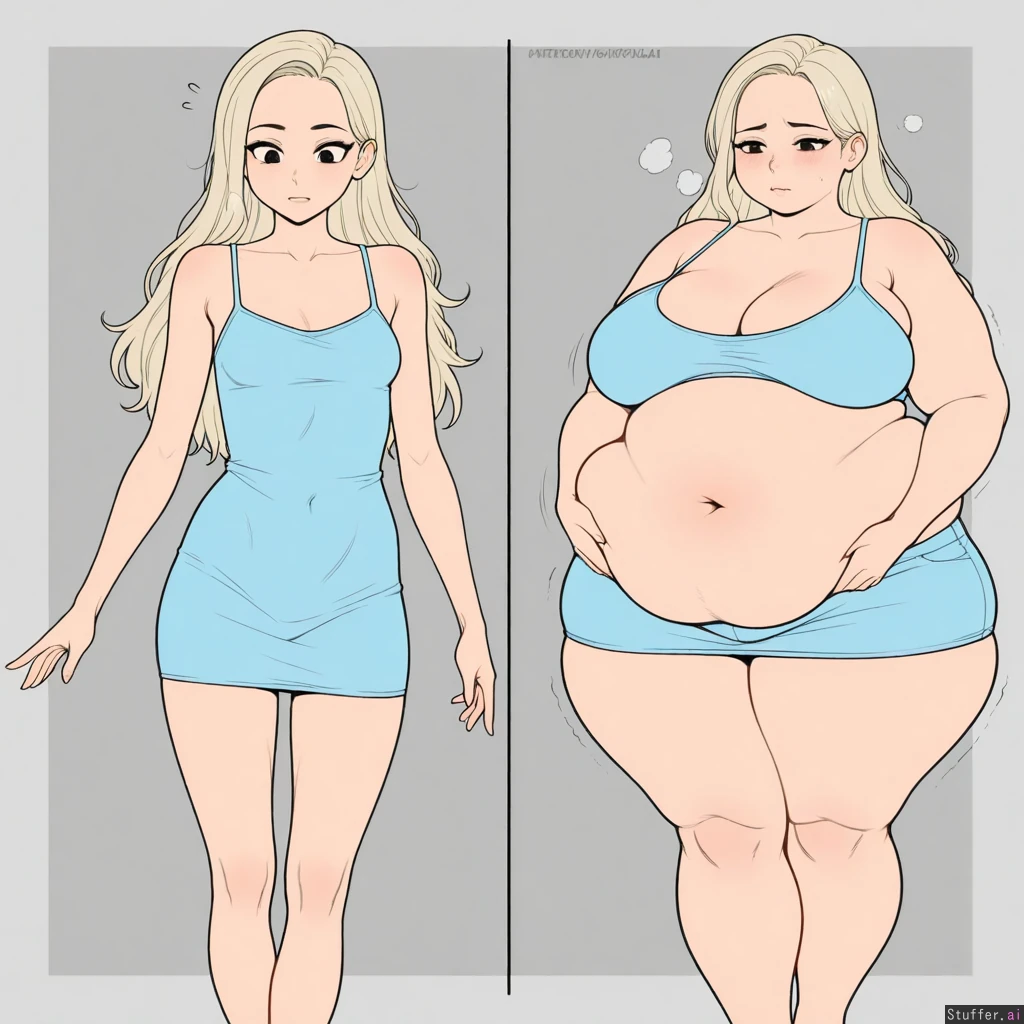 flat color, shading, (kittew(artist):0.5), (blushyspicy(artist):0.3), weight gain before and after, fit to fat, weight gain contrast, (from slim and sexy to enormously morbidly obese girl:1.4), from confident to ashamed and embarassed, jiggly sagging obese belly, big sagging breasts, puffy obese jiggly arms, love handles, massive thighs, fat face, bulging double chin, fat rolls, overflowing fat, breasts resting on top of belly, tight dress, bare arms, summer clothes, cleavage, youthful, platinum blonde, bimbo, classmate, helpless, heavy mouth breathing, head tipped back, jiggle lines, struggling to walk, grabbing her fat, walking,