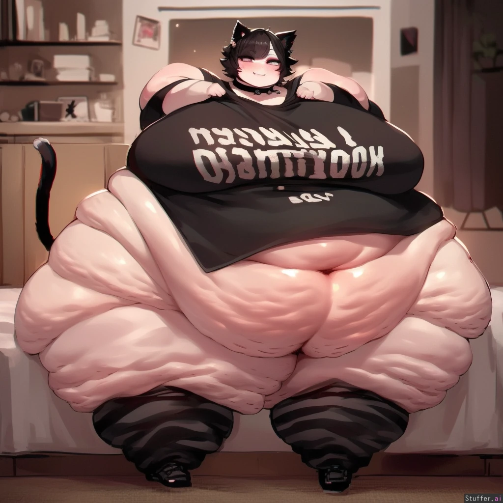 best quality, high rating, high detailed, 4k, accurate anatomy, correct anatomy, c.cu, day, bedroom, pretty face, fluffy body, ((hyper fat bhm student)),(((black hair, short boyish hair, punk, goth, choker, oversized t-shirt))),1 catboy, twink, cat ears, cat tail, collar, hyper fat, fat chest, wide hips, hyper flabby arms, legs, double belly, deep navel, huge hips, hyper ass, huge thighs, huge dark nipples, , seductive, horny, smiling, standing(thick thighs:1.2), ((disproportionately oversized plump legs:2))(chunky thighs:1.3), (giant bubble butt), white and black knee high socks, bigger thighs, (massive thighs), (hyper thighs:2.0),((hyper pear shaped body))((morbidly obese male)) ((cellulite)) ((fat rolls)). Full body image, full shot image