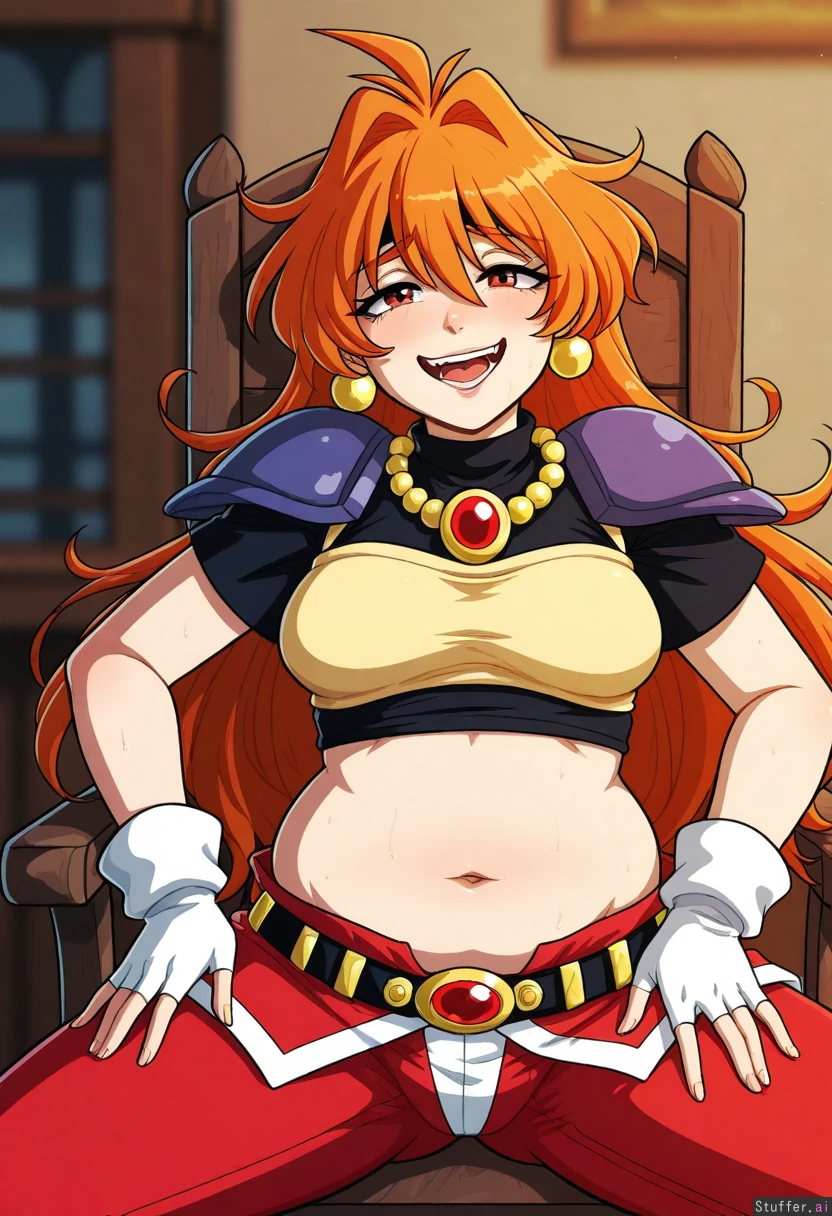 lina_inverse, belly stuffing, satisfied expression, torogao, exhausted, leaning against chair, kinkymations