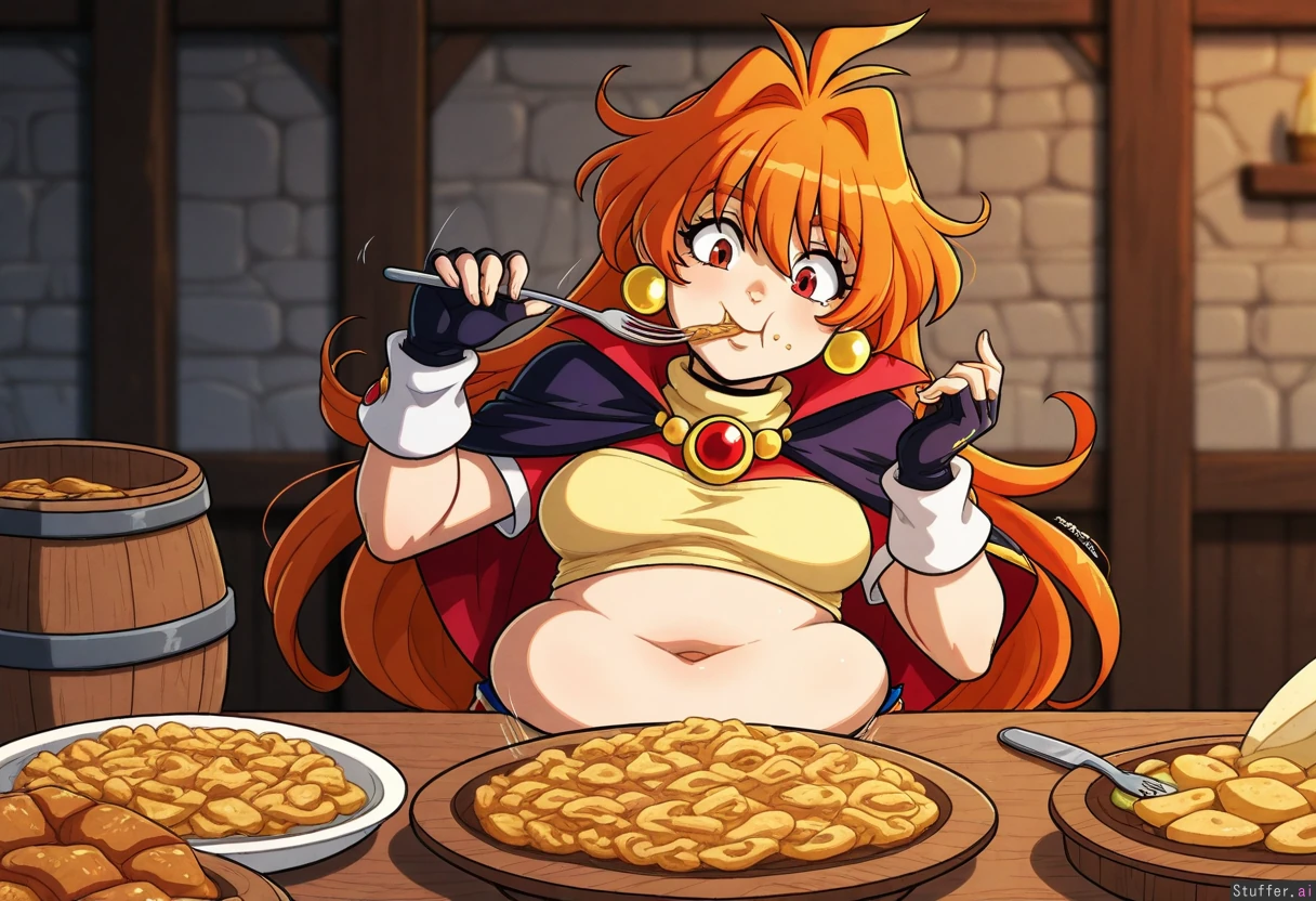lina_inverse, belly stuffing, kinkymations, tavern background, lot of food, hungry, fork in hand, motion lines, eating, food_in_mouth