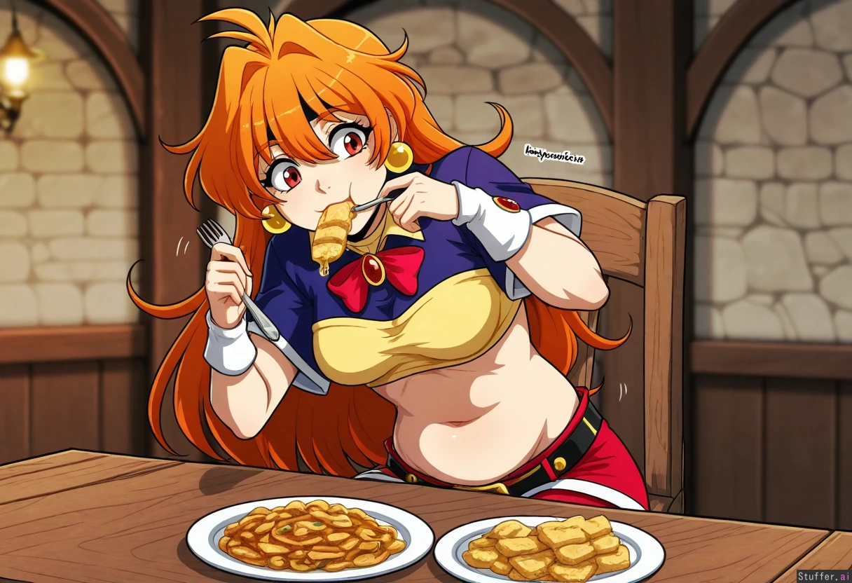 lina_inverse, kinkymations, tavern background, lot of food, hungry, fork in hand, motion lines, eating, food_in_mouth, (empty flat belly:1.3), leaning forward to table, sitting in chair, small belly, medium breasts, fully clothed, lina outfit, mature woman
