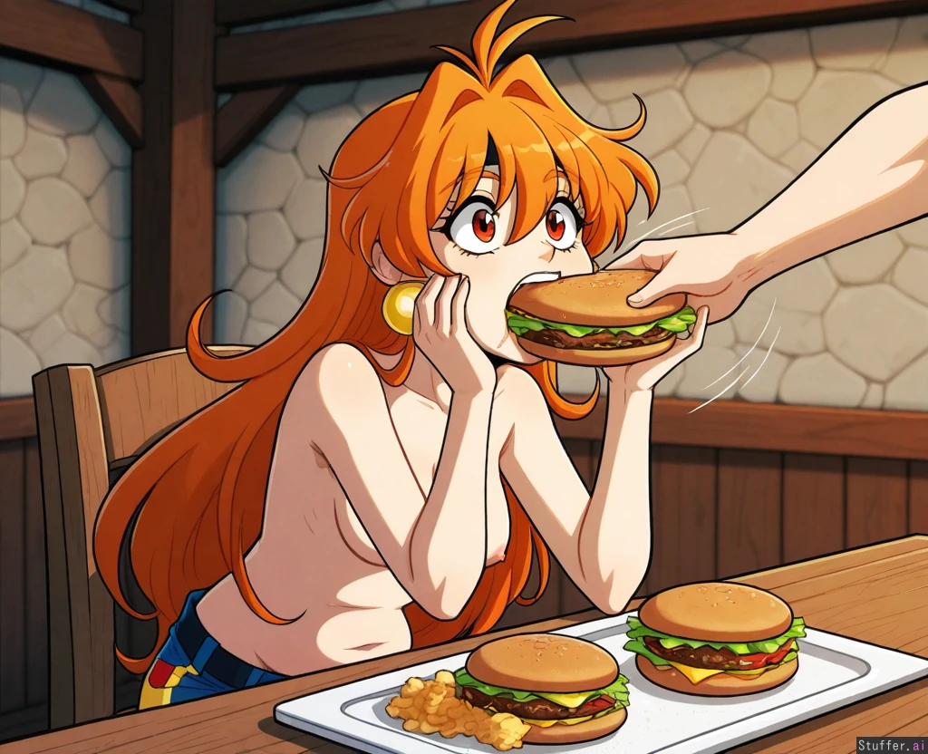 lina_inverse, kinkymations, tavern background, lot of food, hungry, motion lines, eating, food_in_mouth, (empty flat belly:1.3), leaning forward to table, sitting in chair, small belly, medium breasts, topless, thongs, mature woman, hamburger in hand, messy, fast eating, stuffing hamburgers to mouth, mountains of hamburgers at table, (force feeding:1.3), male hand forcefeed lina, belly massage