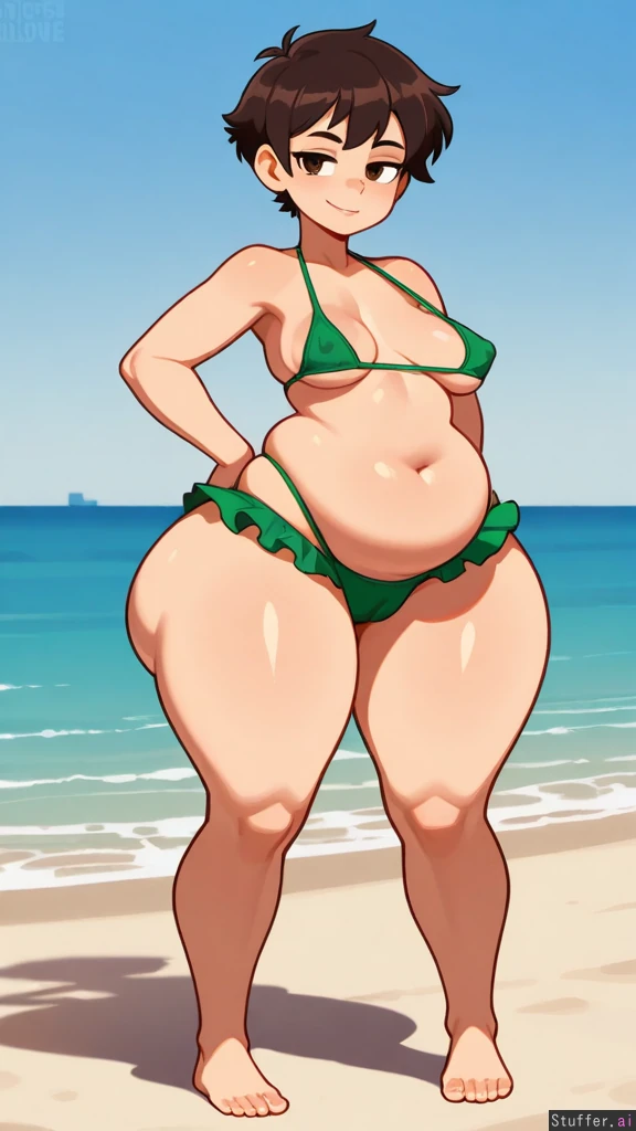 Absurdres, 8k, wamudraws, jaeh, bigbig, huffslove, solo, 1 model, English woman, (milf:1.2), (standing), dark brown hair, short pixie cut hair, brown eyes, (small breasts), (saggy breasts), bulging breasts, (huge covered nipples), (huge puffy areolas), ((flabby belly), sagging belly, belly overhang), (huge butt), (thigh gap), ((gigantic cameltoe)), tight ruffle bikini, bare feet, seductive eyes, looking at viewer, legs apart, beach setting