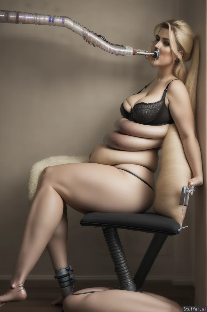 Photo realistic, highly detailed, realistic lighting, blonde bbw, sitting, beautiful face, (wearing a black bra:1.4) , (ultra huge arms:1.6), (ultra huge legs:1.6), (((mouth on feeding tube:1.5))), funnel, arms tied behind back:1.4