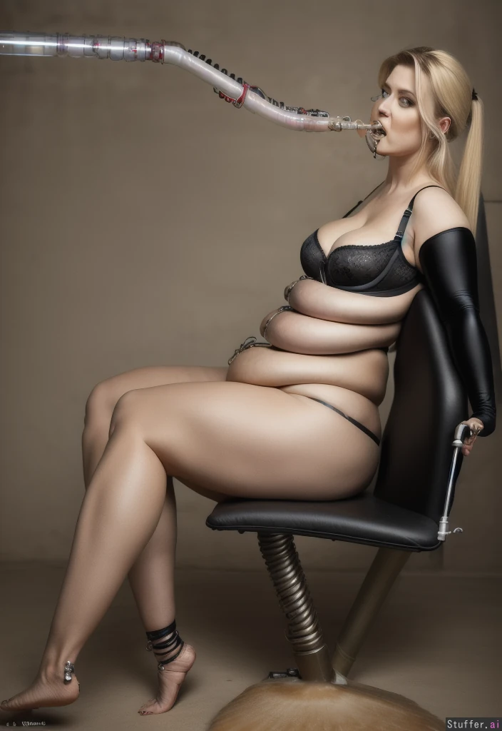 Photo realistic, highly detailed, realistic lighting, blonde bbw, sitting, beautiful face, (wearing a black bra:1.4) , (ultra huge arms:1.6), (ultra huge legs:1.6), (((mouth on feeding tube:1.5))), funnel, arms tied behind back:1.4, bare feet:1.4