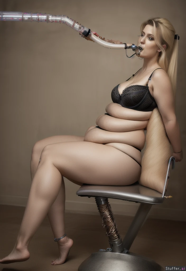 Photo realistic, highly detailed, realistic lighting, blonde bbw, sitting, beautiful face, (wearing a black bra:1.4) , (ultra huge arms:1.6), (ultra huge legs:1.6), (((mouth on feeding tube:1.5))), funnel, arms tied behind back:1.4, bare feet:1.4