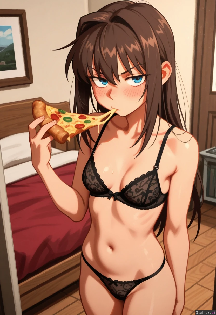 solo,1girl,High resolution, high definition, 8k, masterpiece, best_quality, high_rating, khyle. /(artist/), noodlenood /(artist/) , (wamudraws /(artist/):1.0) Aoko: aozaki_aoko_(mahoutsukai), young, bedroom, horny expression, seductive, embarrassed, black bra, black panties, blue_eyes, (skinny face), slender skinny body, (bloated belly:0.99), petite breasts. reluctantly eating huge pizza. Reluctant salivating facial expression with chewing pizza.