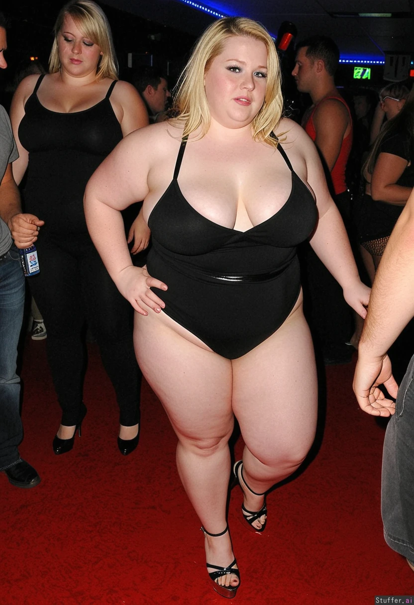 Chubby blonde girl, in slutty outfit, on the dance floor at a club