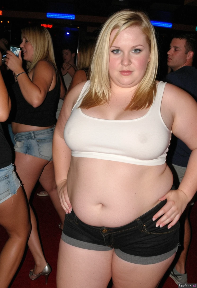 Chubby blonde girl, in slutty shorts and croptop, on the dance floor at a club