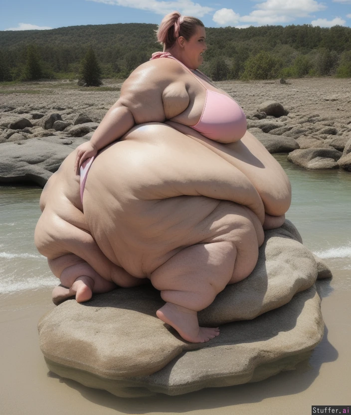 Side view of gigantically obese blob girl with massive belly in front and giant ass Im back. (Pink bikini), (Pigtails), (Extremely wide), (Immobile ussbbw:1.4)