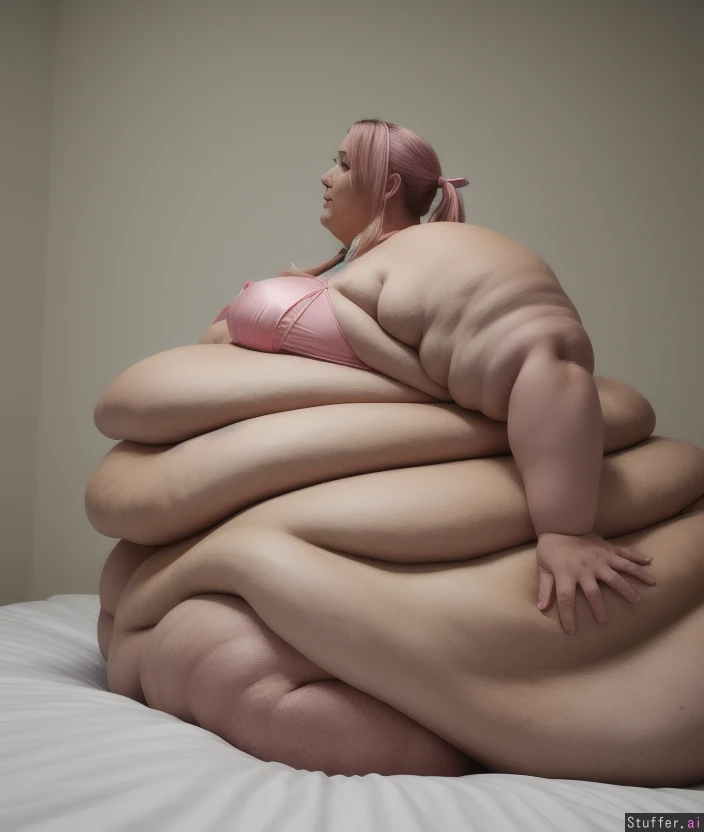 Side view of gigantically obese blob girl sitting in bed. massive belly in front and giant ass Im back. Immobile in bed. (Pink bikini), (Pigtails), (Extremely wide), (Immobile ussbbw:1.4)