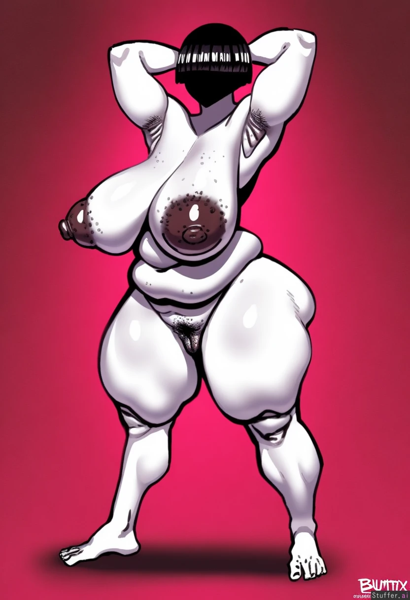 best quality, high rating, detailed fellatrix drawing cartoon sketch style, side view, side breast front view, wide stance, face mask, tall mommy, hairless armpits, hairless pussy, neon white skin, North African berber woman, blunt black bangs over eyes straight short hair, fat hourglass milf, plump, plump pussy, plump face, chubby arms, hands behind head, big breasts, big puffy nipples, bumpy areola, dark nipples, wide hips, thick legs, venus body, completely naked, high arched wide feet, thick meaty soles bbw feet, thick curvy feet, barefoot, neon pink background, full body view,