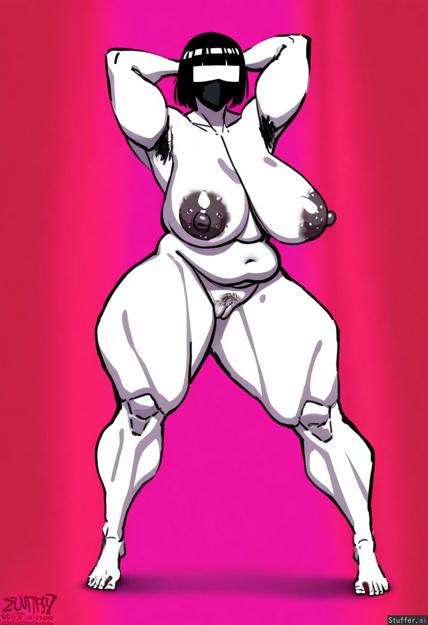 best quality, high rating, detailed fellatrix drawing cartoon sketch style, side view, side breast front view, wide stance, face mask, tall mommy, hairless armpits, hairless pussy, neon white skin, North African berber woman, blunt black bangs over eyes straight short hair, fat hourglass milf, plump, plump pussy, plump face, chubby arms, hands behind head, big breasts, big puffy nipples, bumpy areola, dark nipples, wide hips, thick legs, venus body, completely naked, high arched wide feet, thick meaty soles bbw feet, thick curvy feet, barefoot, neon pink background, full body view,