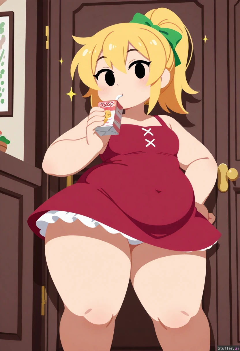 Vanripper(artist), debyjull(artist), merunyaa(artist), cross-crescent(artist), wamudraws(artist), kipteitei, ((lineless:1.4)), (1girl), (Roll-Chan), fully clothed, blonde ponytail, red dress, green bow in hair, (standing), (drinking a juice box), (((petite:1.8)), ((fat face:1.2)), (obese neck), (smiling), ((hyper obese, fat arms, fat legs, morbidly obese:1.1)), ((hyper thighs:1.3)), ((small breasts)), white panties, upskirt, legs_apart, white underskirt, full_body, (standing in a bedroom that is 50 times larger than normal),