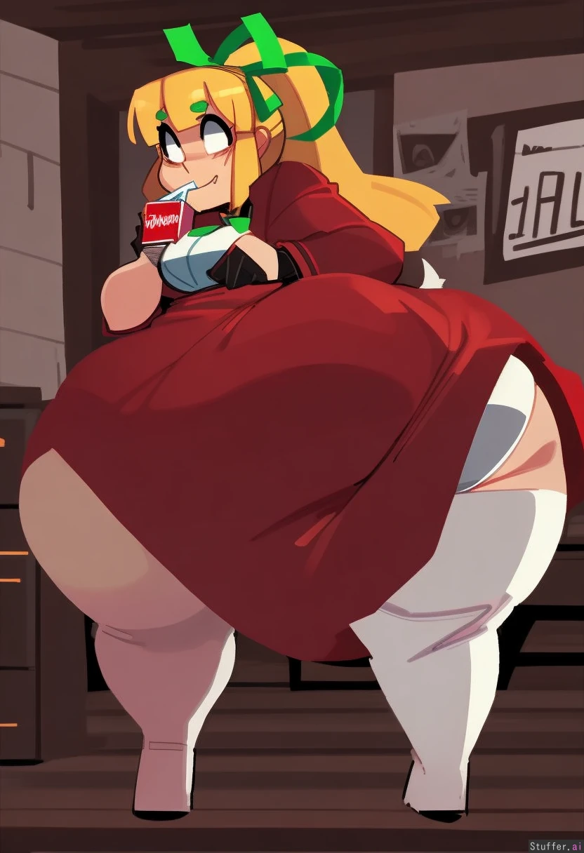 best quality, high rating, Vanripper(artist), debyjull(artist), merunyaa(artist), cross-crescent(artist), wamudraws(artist), kipteitei, ((lineless:1.4)), (1girl), (Roll-Chan), fully clothed, blonde ponytail, red dress, green bow in hair, (standing), (drinking a juice box), (((petite:1.8)), ((fat face:1.2)), (obese neck), (smiling), ((hyper obese, fat arms, fat legs, morbidly obese:1.1)), ((hyper thighs:1.3)), ((small breasts)), white panties, upskirt, legs_apart, white underskirt, full_body, (standing in a bedroom that is 50 times larger than normal),
