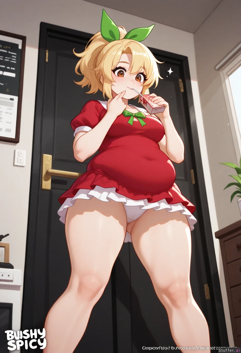 UHD, HDR, smooth texture, 4k, icecake, c.cu best quality, high rating, best quality, high rating, lJaykuma(artist),betterwithsalt(artist),blushyspicy(artist), Trinityfate(artist), perfect detail, high resolution, 4k, ultra HD, 1080p, (1girl), (Roll-Chan), fully clothed, blonde ponytail, red dress, green bow in hair, (standing), (drinking a juice box), (((petite:1.8)), ((fat face:1.2)), (obese neck), (smiling), ((hyper obese, fat arms, fat legs, morbidly obese:1.1)), ((hyper thighs:1.3)), ((small breasts)), white panties, upskirt, legs_apart, white underskirt, full_body, (standing in a bedroom that is 50 times larger than normal),