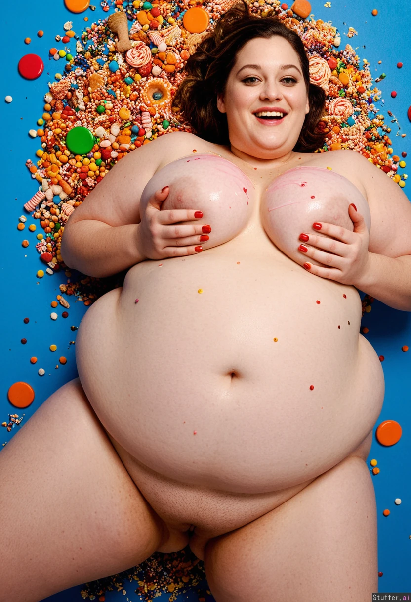Marion_Cotillard beautiful in her thirties. She is a happy obese blob, showing her full fat body covered in desserts, surrounded by candy and desserts, messy slob in a bright colored fantasy