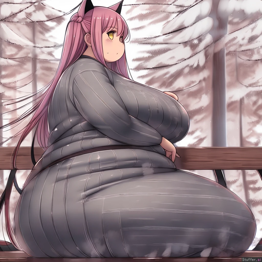 best quality, high rating, betterwithsalt (artist), kurocaze-s (artist), miramiraclerun (artist), KipTeiTei (artist), Orristerioso (artist), c.cu (artist), pixiveo (artist), 1 girl, solo, long straight hair, pink hair, yellow eyes, cat ears, cat tail, gray bodysuit, park, sitting on bench, expressionless, drinking big bottle of coke,