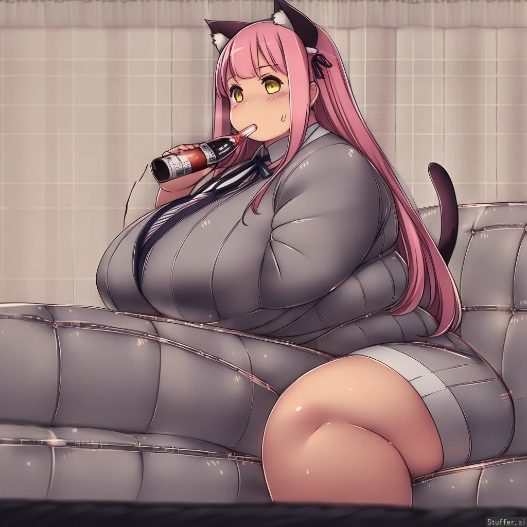 best quality, high rating, betterwithsalt (artist), kurocaze-s (artist), miramiraclerun (artist), KipTeiTei (artist), Orristerioso (artist), c.cu (artist), pixiveo (artist), 1 girl, solo, long straight hair, pink hair, yellow eyes, cat ears, cat tail, gray bodysuit, living room, sitting on couch, expressionless, drinking big bottle of coke,